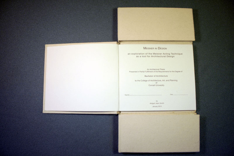 The choice to hold true to the tenets of Meisner design, developed and explored through the thesis project itself, and carry them on into the creation of the book resulted in a "Meisner designed book". The book takes on the complex, non-linear, interconnected structure of the thesis project itself providing the reader the opportunity to explore the connections in the material fully and perhaps discover new ones.