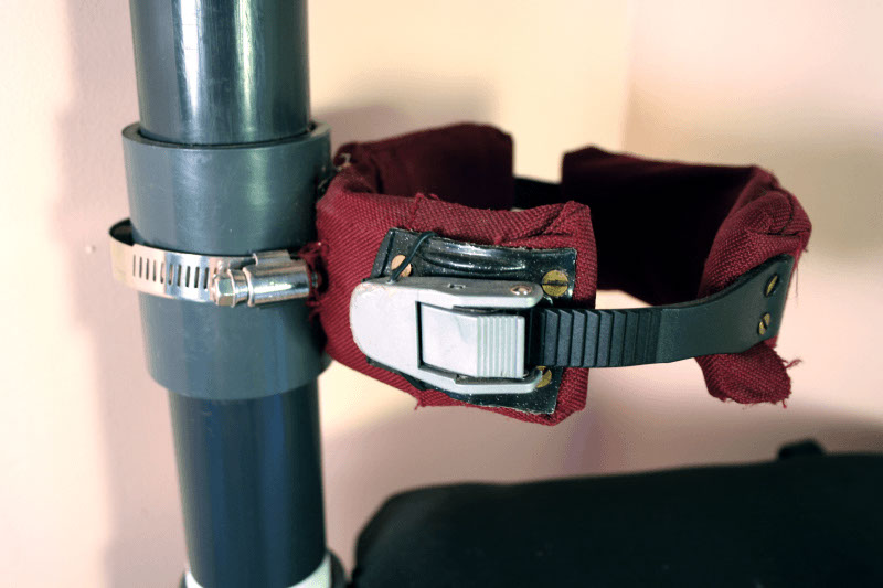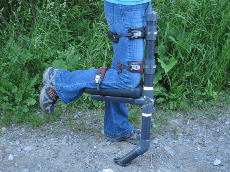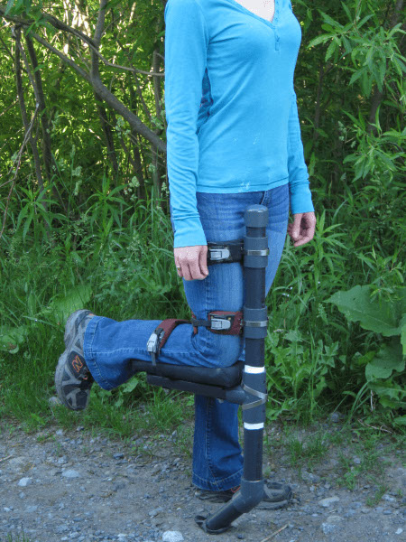 This leg crutch mimics the commercial “iWALKFree” crutch delivering the same functionality but at the mere cost of a few PVC pipes, a cast off backpack, and a pair of old rollerblades from Salvation Army.