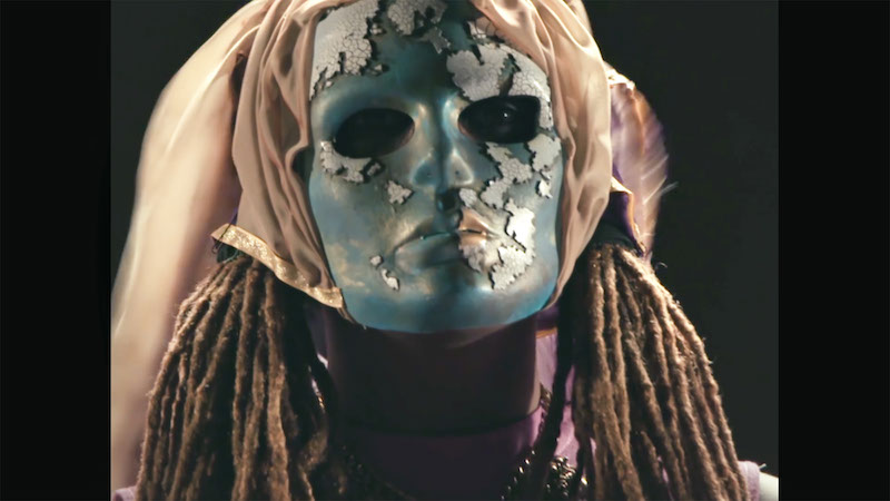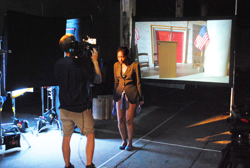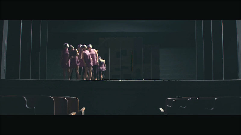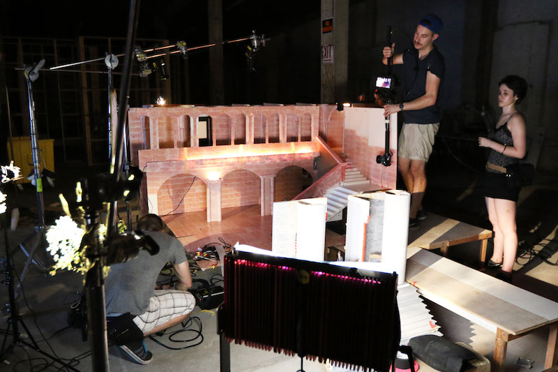 The visual conceit of the film led to the exploration of miniatures in real time composite with live action by way of piloting a camera through a model and live feeding to a projector screen behind the action. This enabled the actress to remain fairly stationary for the majority of the film allowing us to achieve our goal of consistent close focus. In addition to the main narrative the themes of the film are augmented by an opening dance piece featuring masked dancers.
