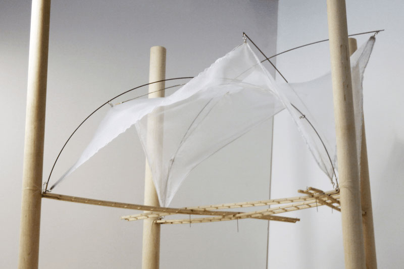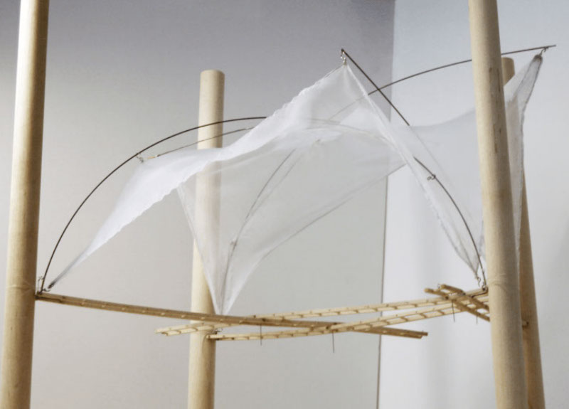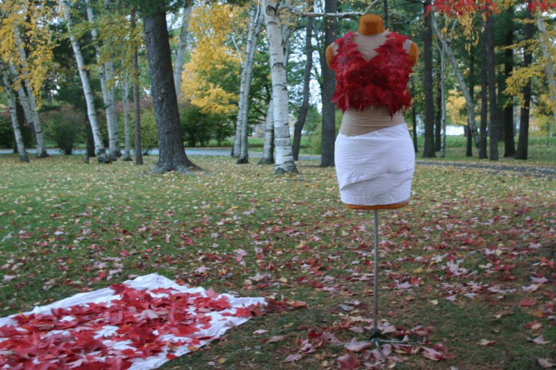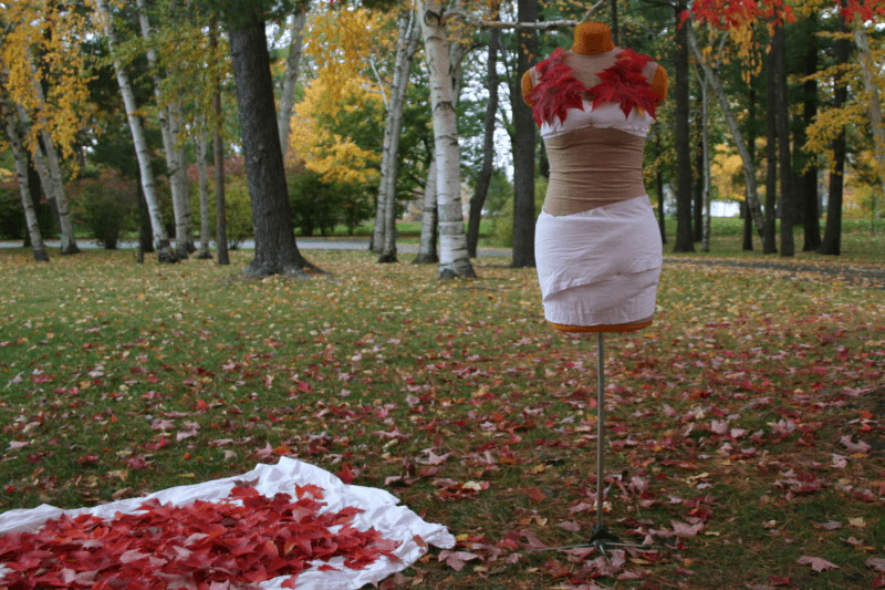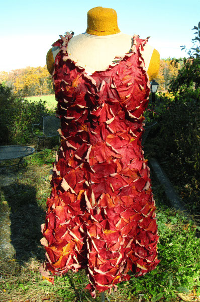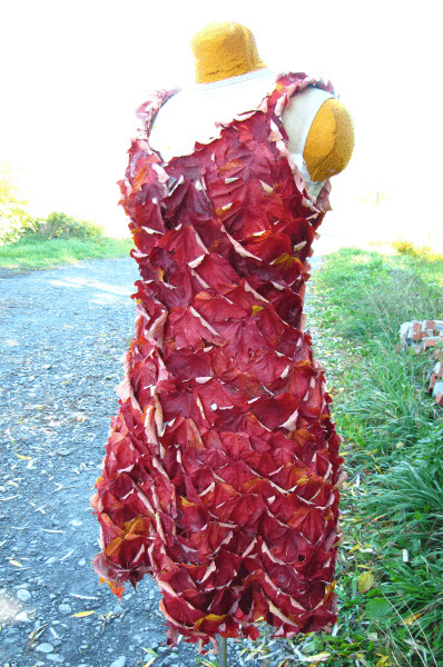 Due to the nature of the material this piece had to be completely constructed over a period of roughly 48 hours. Beyond that time the leaves had dried to the point of being too brittle to work with. This dress is constructed solely of leaves without any thread, glue, pins, staples or fastening materials of any sort. The leaves are joined by a technique of weaving each leaf's stem back into the prior layer of leaves.