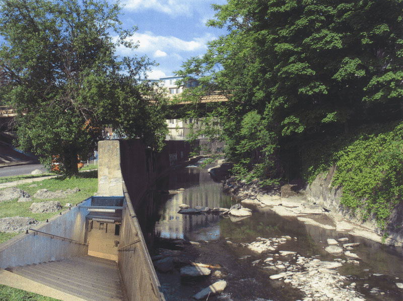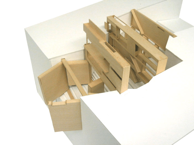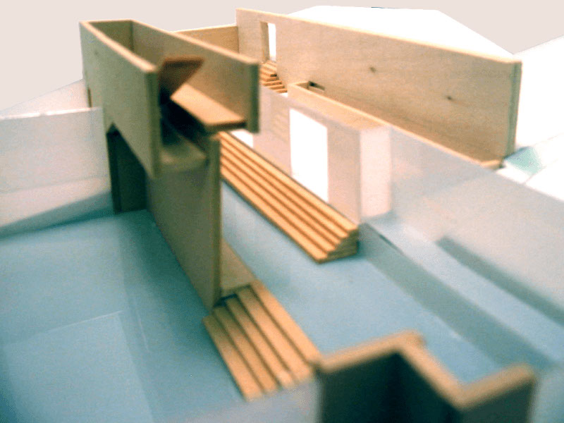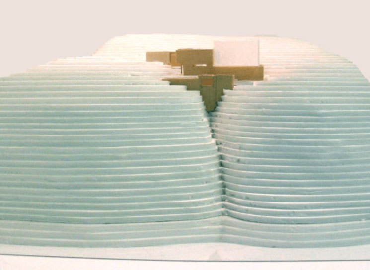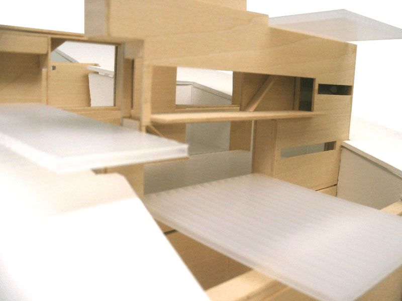 This house was designed based on the model of a water lock and is incorporated directly into the natural gorge on the site. The house consists of four heavy lock walls, sunk into the gorge, that suspend between them the light filled spaces of the house above. The lock walls allow, through manipulation of the lock doors, the occupant to control the water levels surrounding and throughout the house.