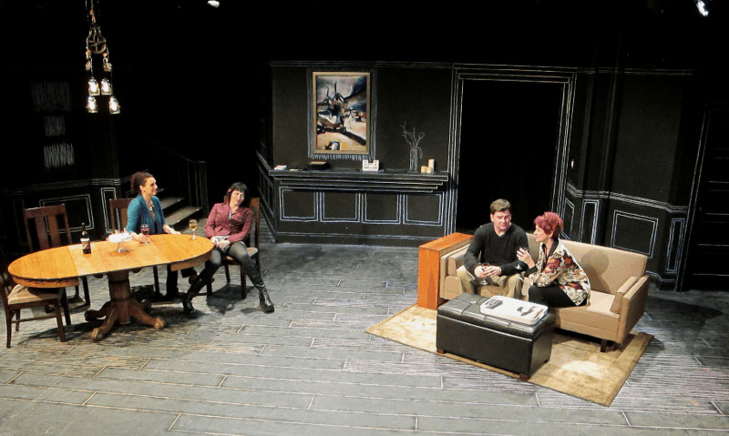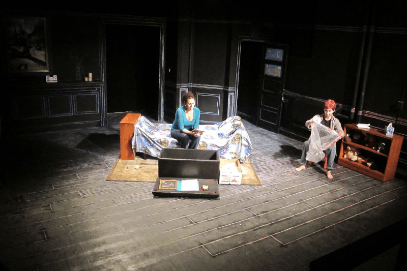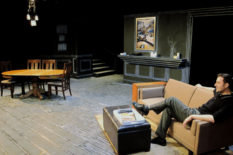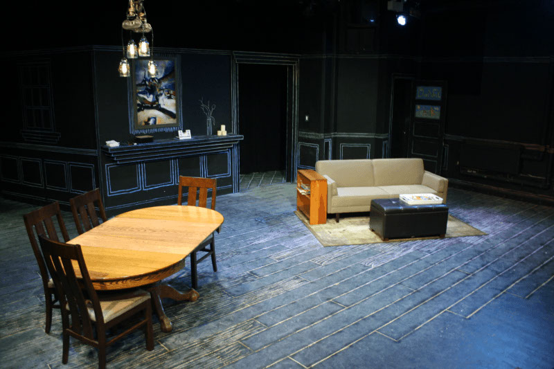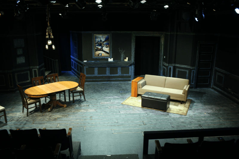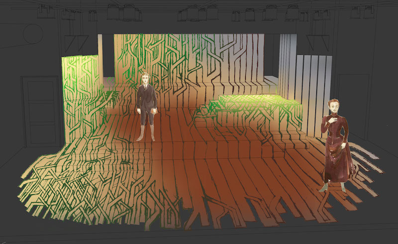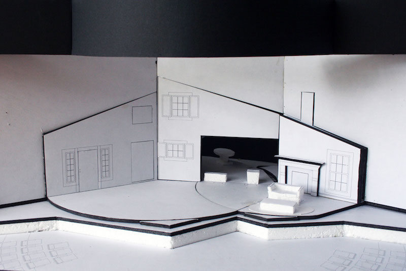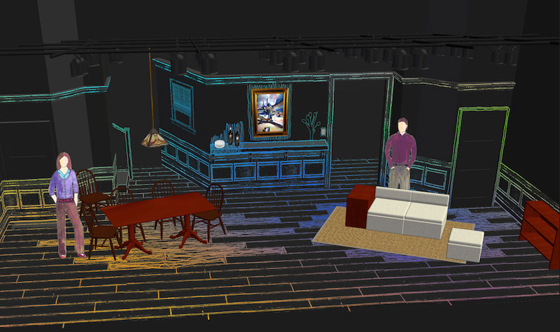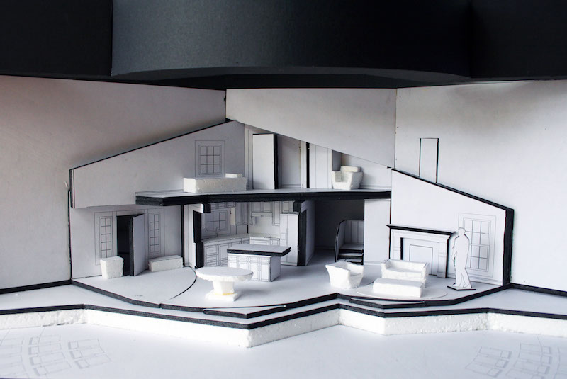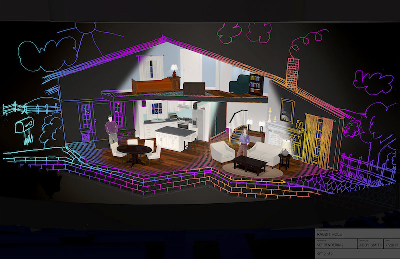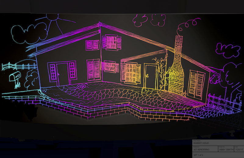 This design sought to both express the style and elegance of the couple's home while giving voice to the absence of their young son who is still the focus of their lives. The etching of the set in colored chalk was inspired by a common style of children's drawing where a black overcoat is selectively scratched away to reveal a layer of bright colors.