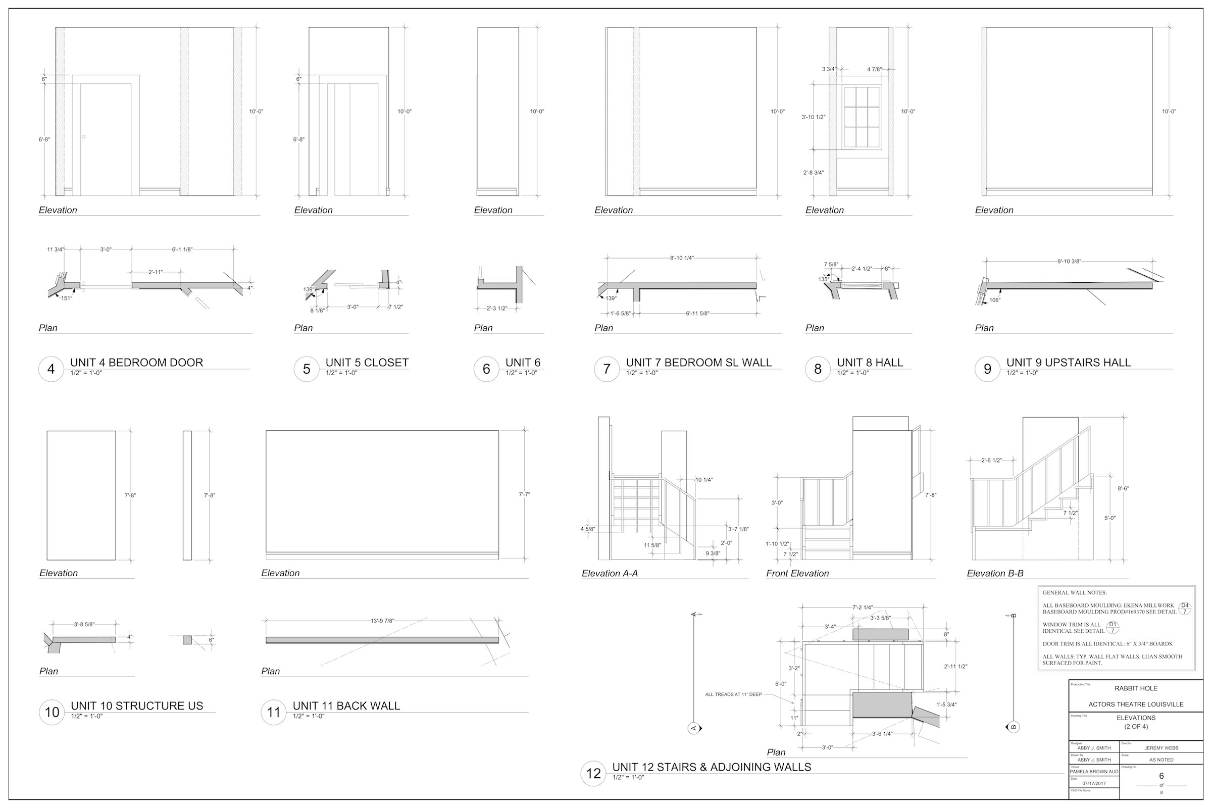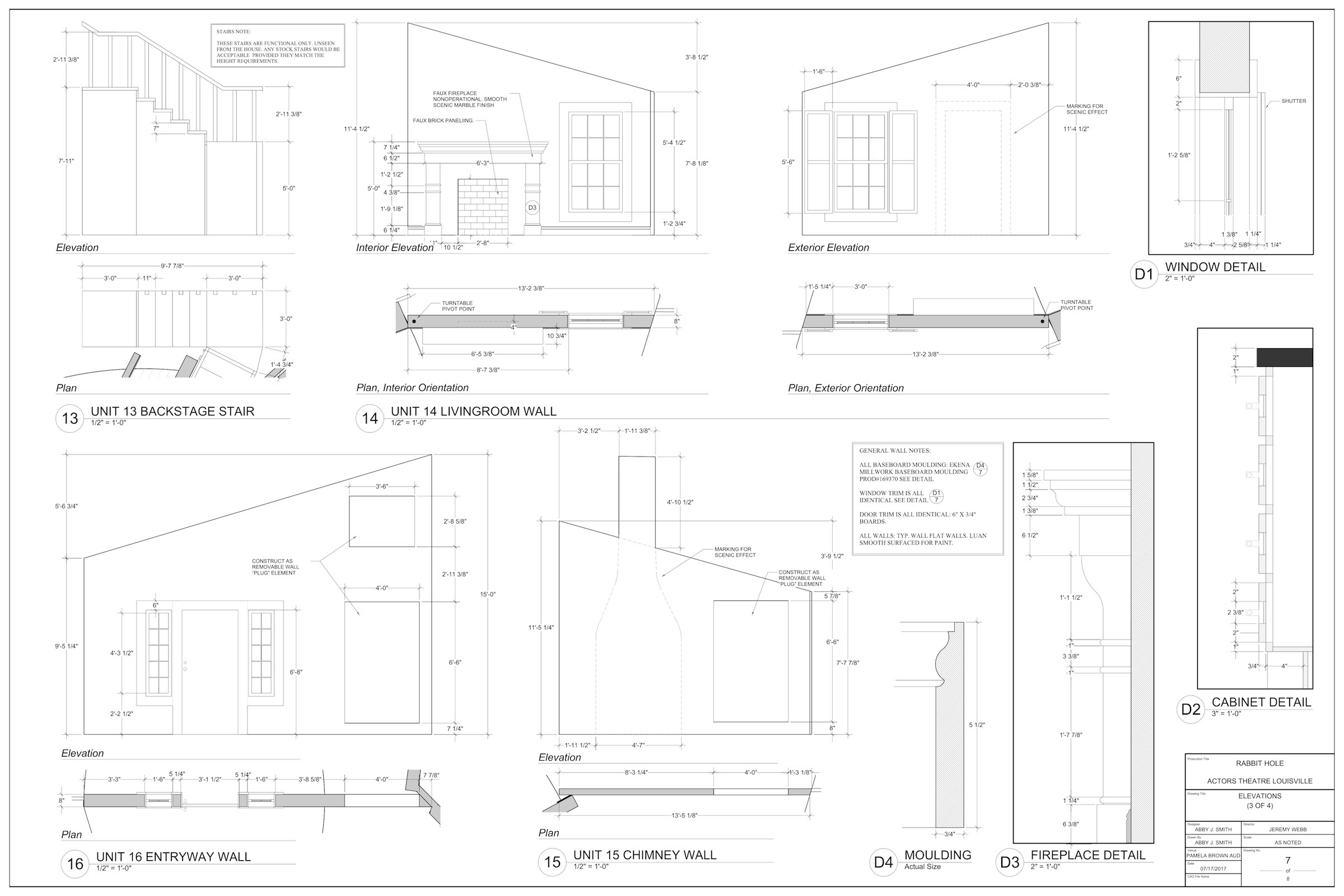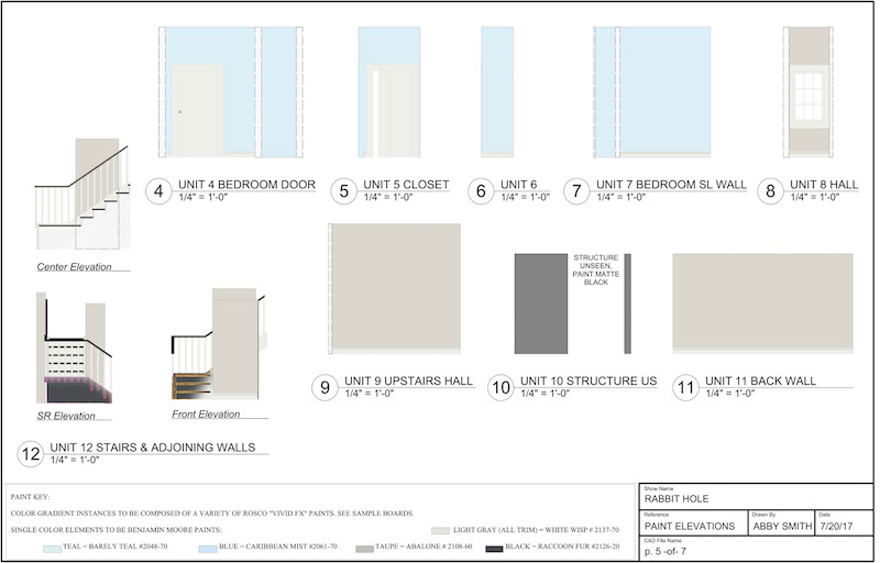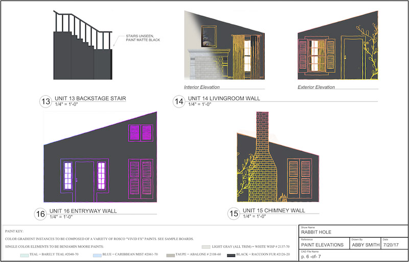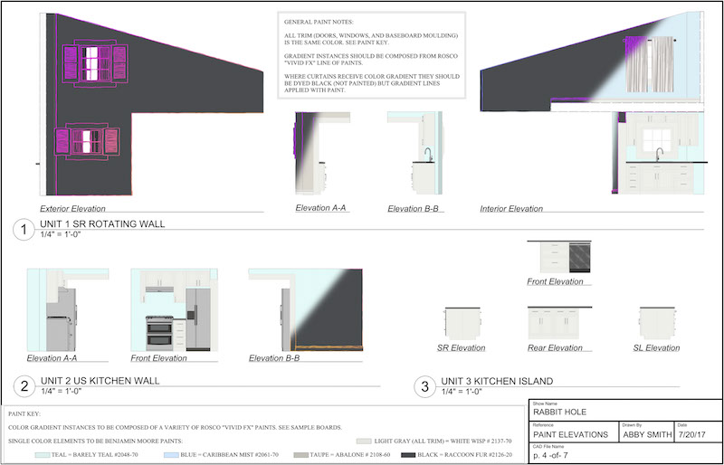 Drafting and paint elevations here are from the redesign of the Actor's Workshop produced design above. This redesign, which is for a much grander production of the play, was completed for my Local USA 829 application presentation. Renderings and images of the model can be found in the Set Design section above.