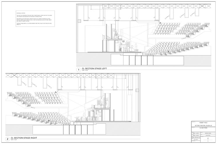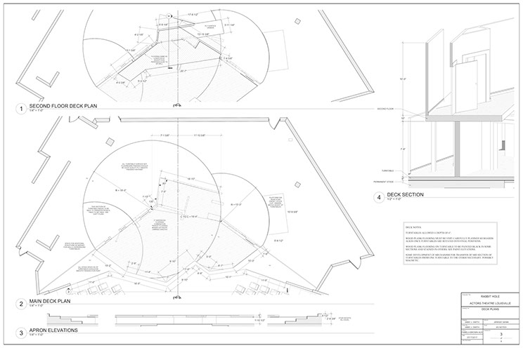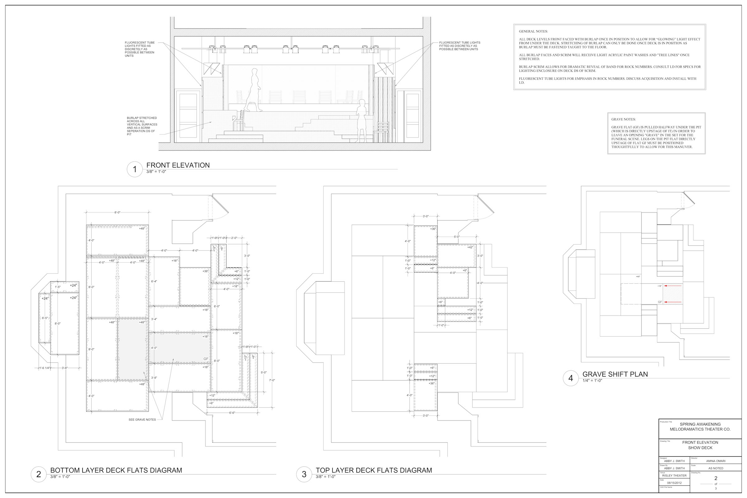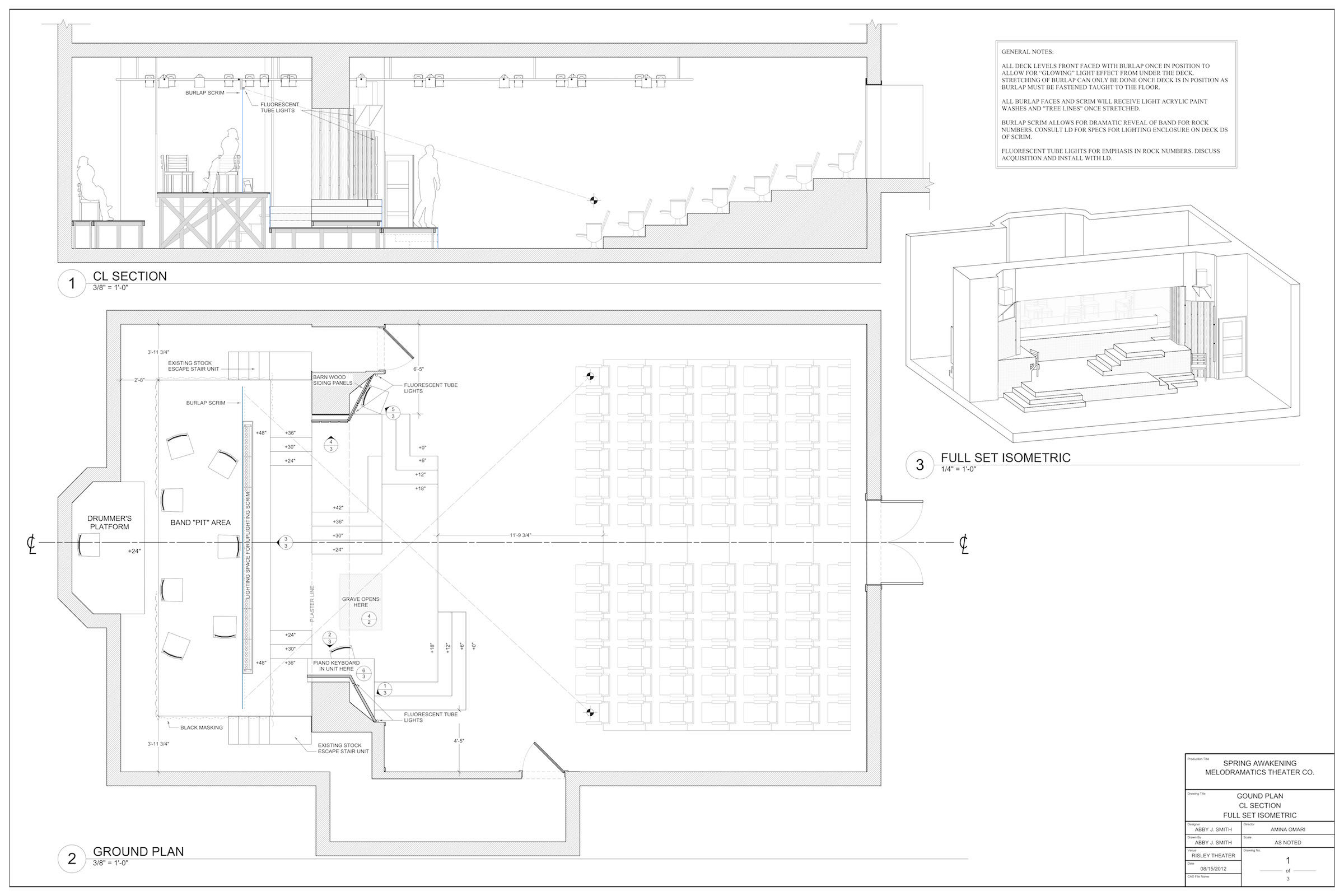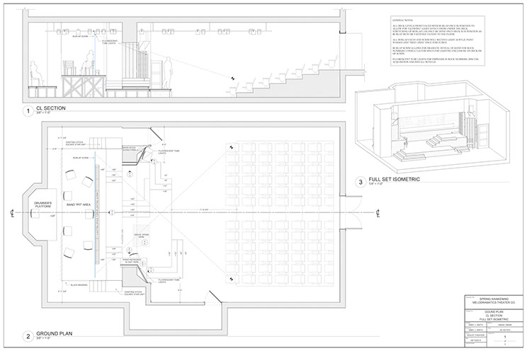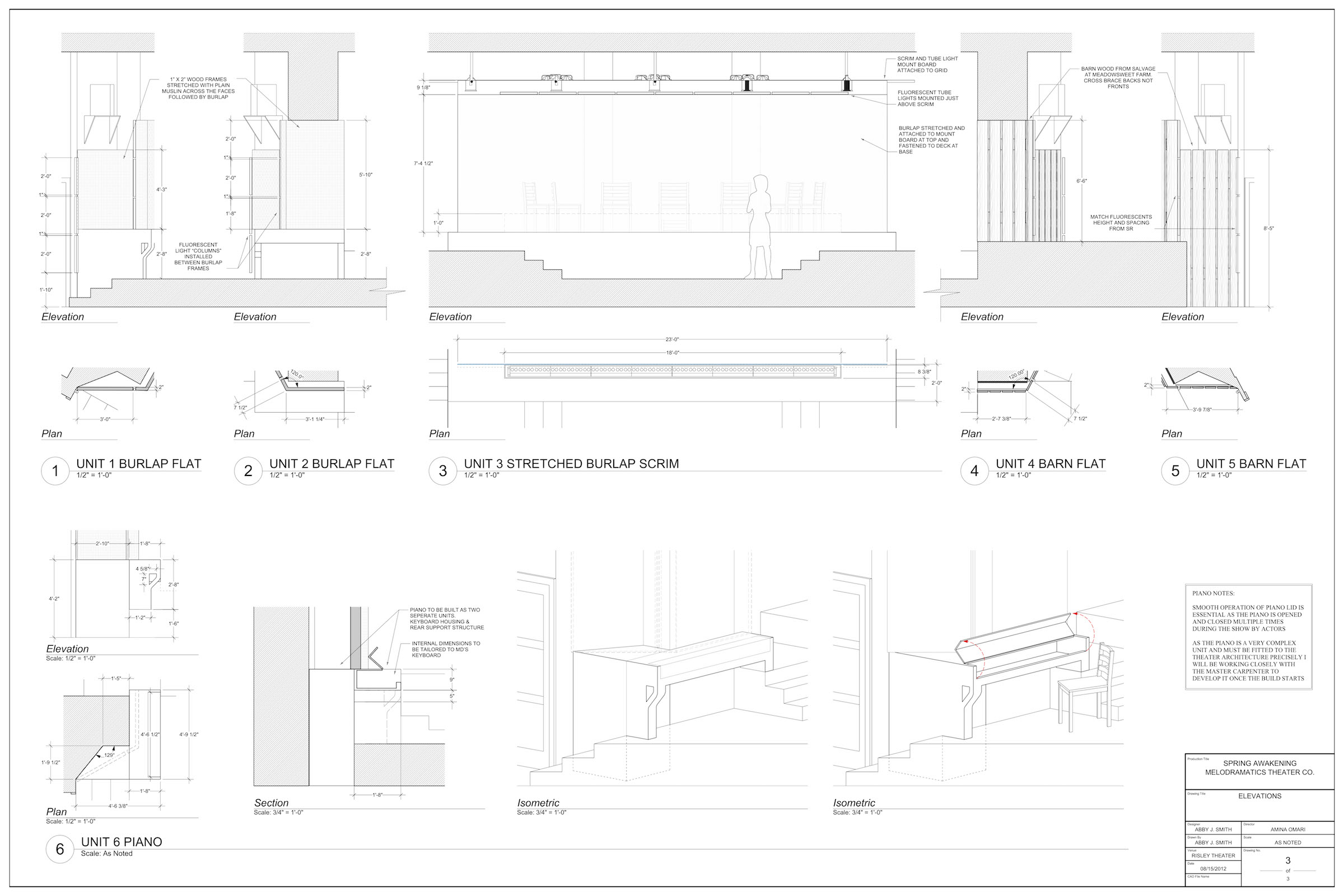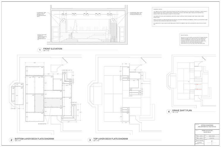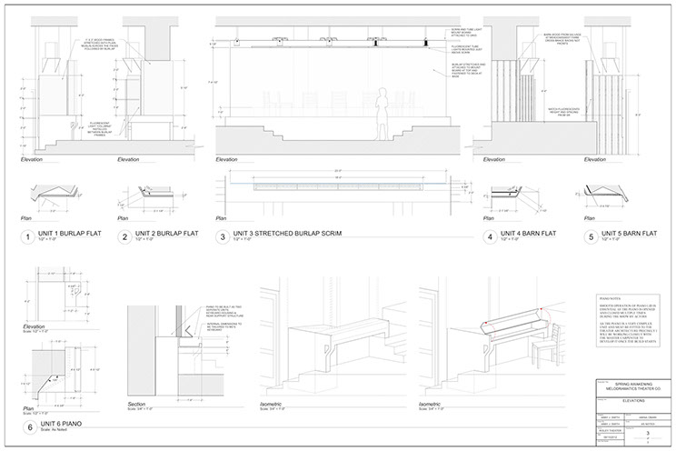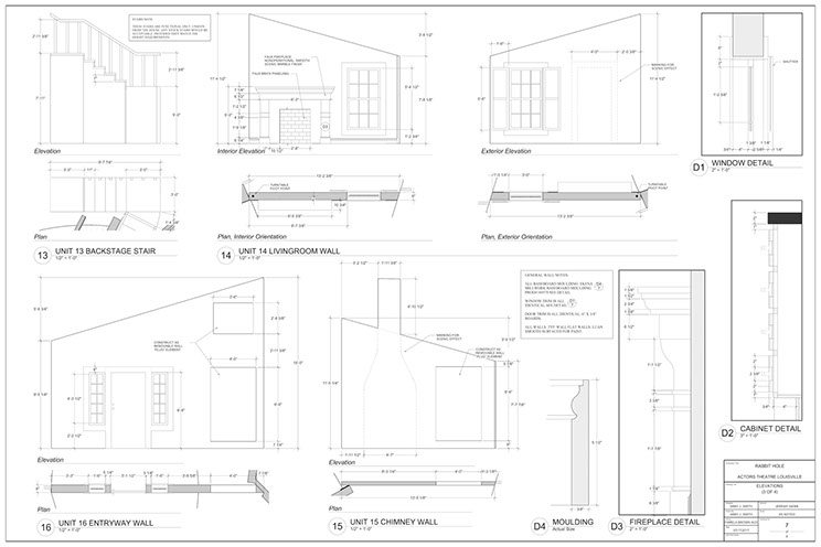 Drafting here is from the Melodramatics produced design featured earlier on this page. As I was both designer and master carpenter for the production not all details are fully developed in the drafting. In some cases it was most time efficient to simply measure and build components to fit once on set.