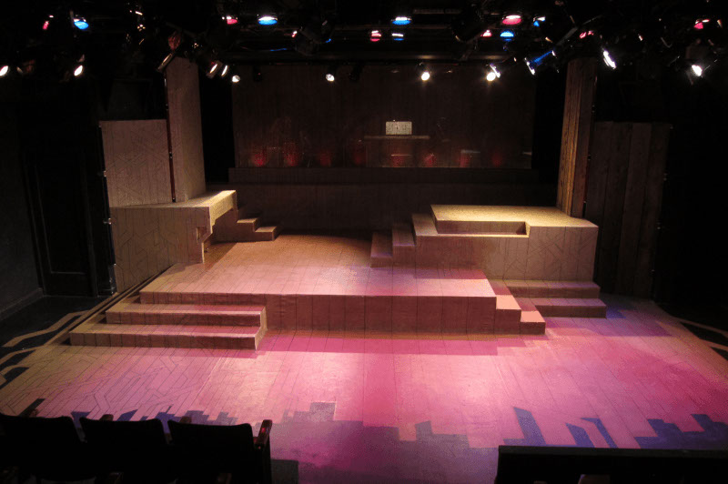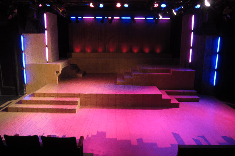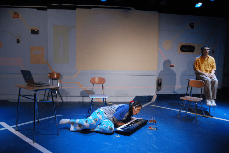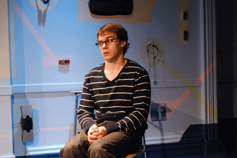 Creating a visual and spatial world that spoke of modern technology was the seminal aim of this set design. Incorporating both the implements of communication (the phones, keyboards, computers, etc.) as well as the social media icons of our time.