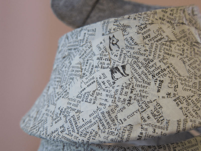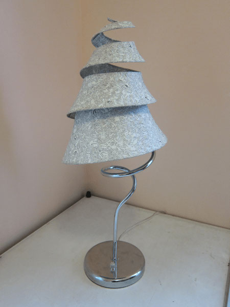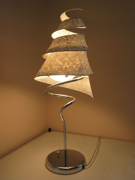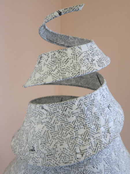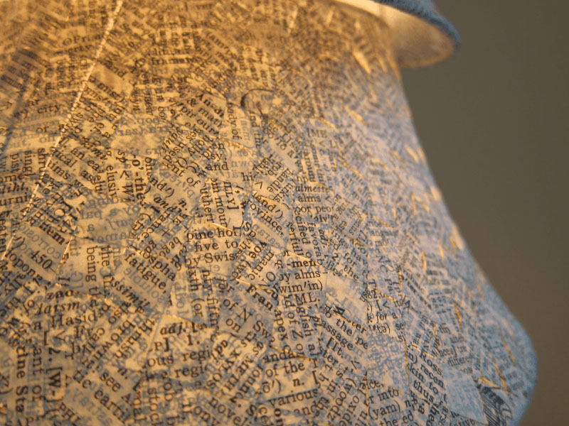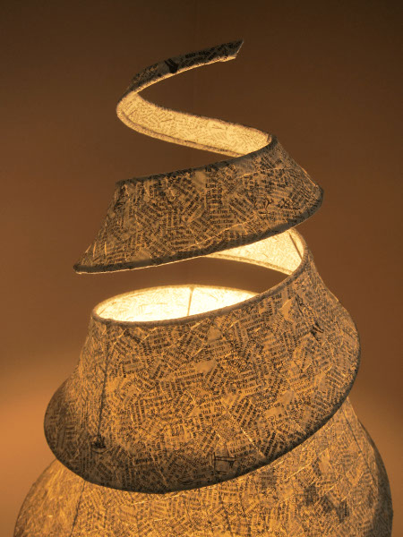 The base for this lamp was found at a thrift store. The form of the stand inspired the form of the shade. The shade was created from an old dictionary, cut into thin strips and woven directly onto a twisted and soldered wire frame.